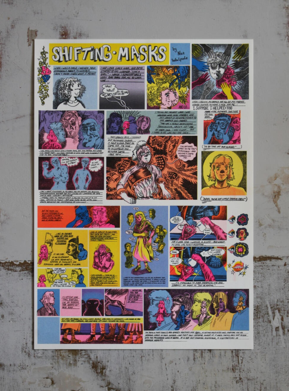 "Shifting Masks", an A2 risograph comic produced for Glasgow GOMA's Queer Times School Prints project, 2019. (c) Nat Walpole